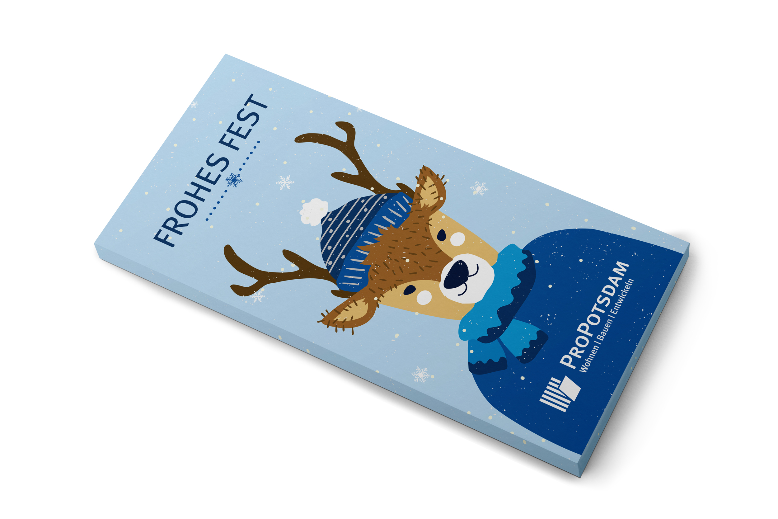 Verpackung: Schokolade mit Elch-Illustration für Weihnachten